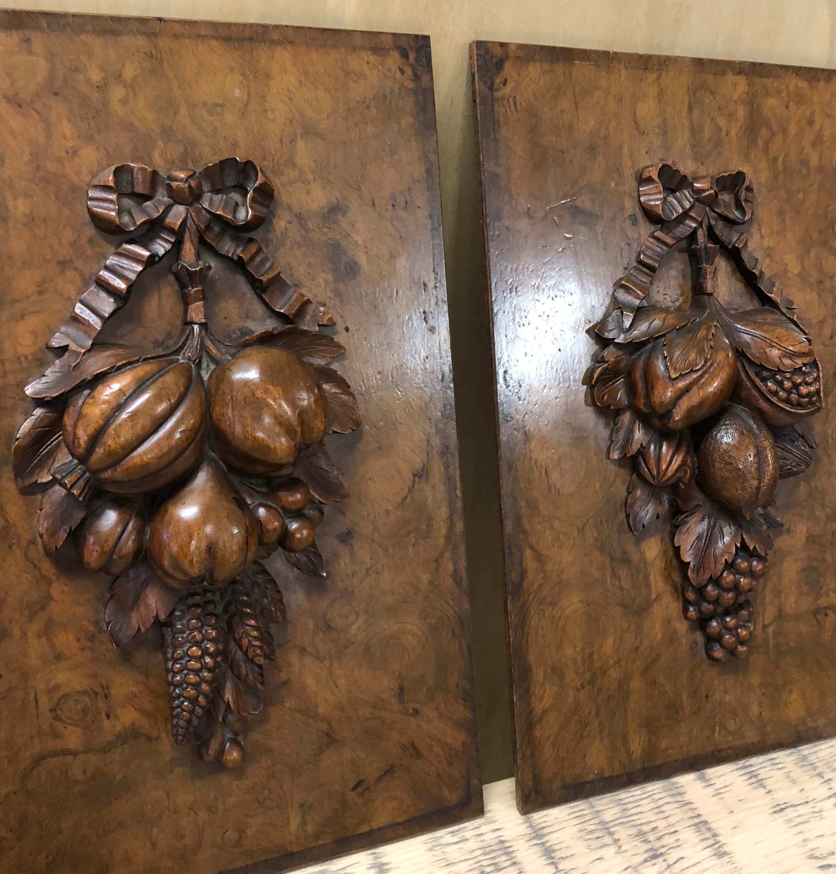 X2 Antique French Carved Panels from arkvintage.com. A pair ( although each unique Check pictures) of beautifully hand carved from French fruit wood with a fabulous patina. See pictures for more detail. Sold as a pair they are over 100 years old and would have been part of a grand piece of furniture. Could be framed or hung as they are with the eyelets and cord on the back.