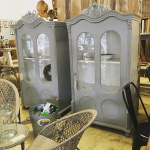 We have a pair of French vintage cabinets in stock which are very similar in style. Both feature wide shelving and ornate detailing. They are finished in the same grey matt paint and are available for purchase individually or as a pair. These are wonderful statement pieces.
